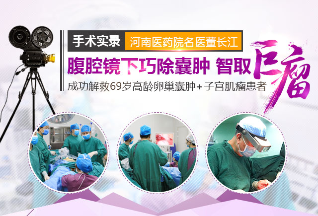 手术导读 2016年7月26日,河南医药院妇科主任董长江再次娴熟的运用腹腔镜为来自河北的69岁高龄患者陈女士(化名)实施了高难度腹腔镜下卵巢囊肿切除术+双侧附件切除术+全子宫切除术,成功的剔除了4*5cm超大卵巢囊肿和5*6cm巨型子宫肌瘤!